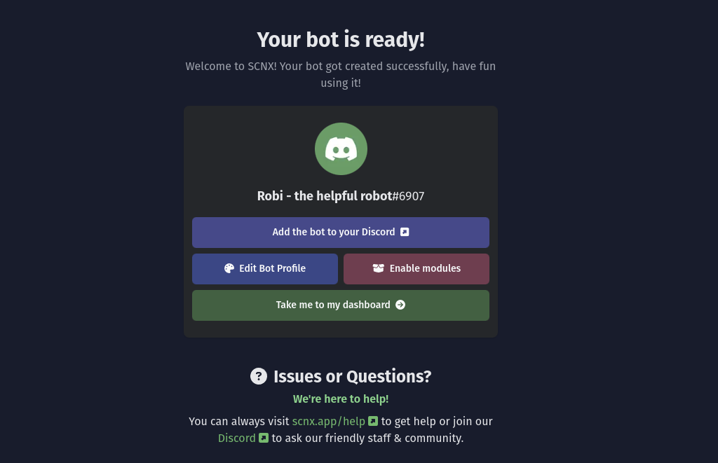 Sobald du deinen Bot zu deinem Server hinzugefügt hast, ist dein Bot bereit, SCNX zu verwenden. Kehre zu der Einrichtung zurück und editierte das Profil deines Bots mit dem "Bot-Profil bearbeiten" Knopf (das kannst du auch später machen), Module aktivieren oder alle Funktionen deines Bots entdecken.