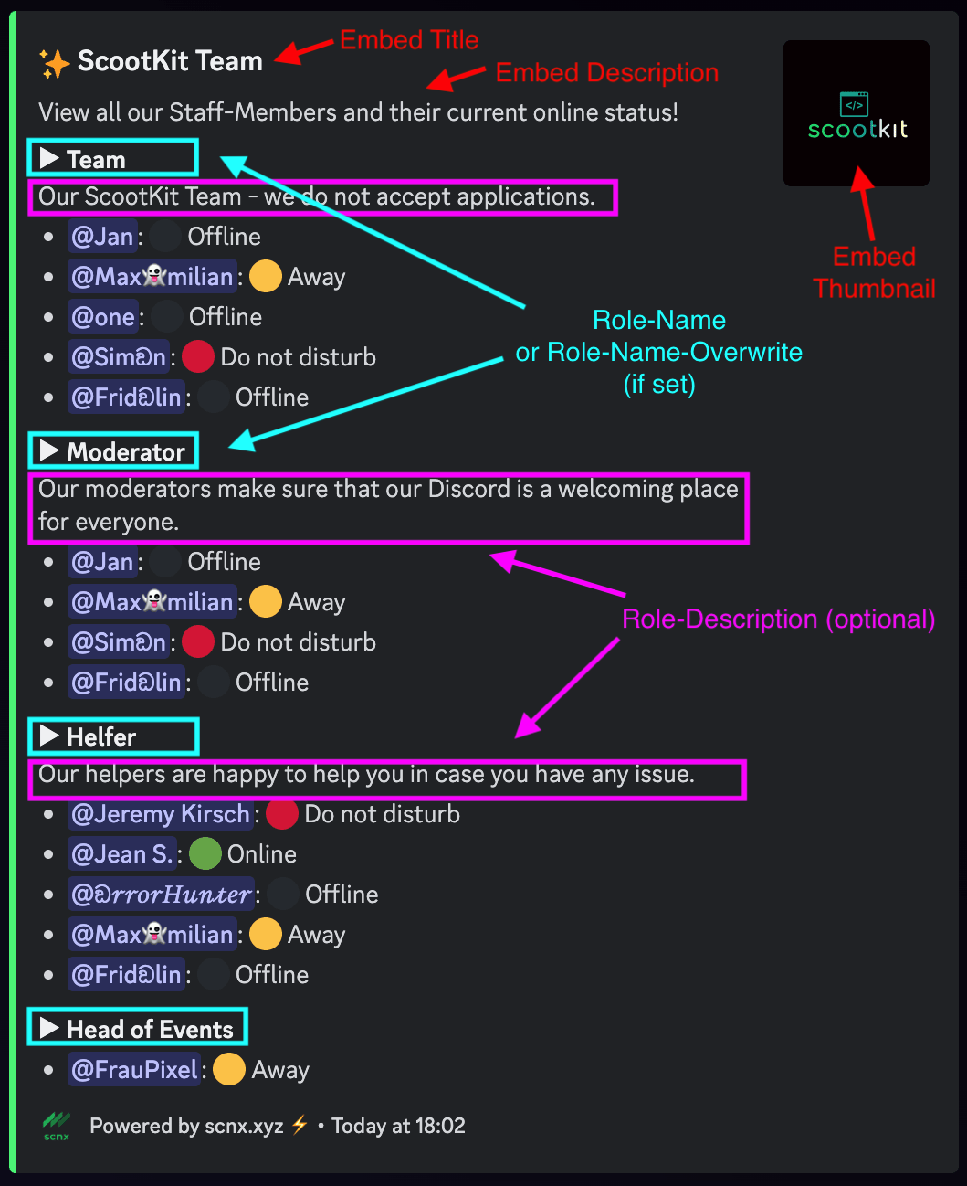 Zeige alle deine Teammitglieder und erkläre Teamrollen in einem immer aktuellen Embed.